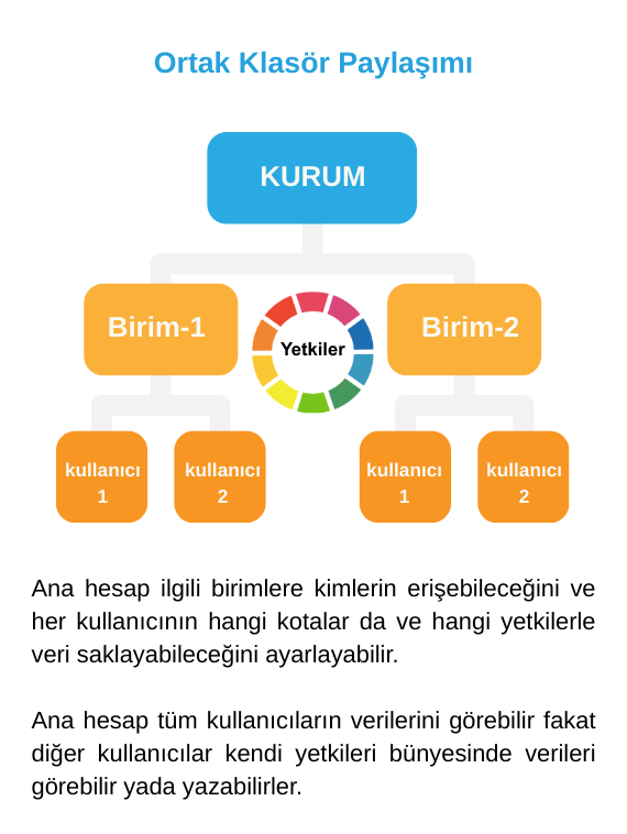 Sisteminize alt kullanıcılar açarak istediğiniz klasörlerinize kullanıcılara vereceğiniz yetki dahilinde paylaşabilirsiniz. Bir kurumda ilgili birimlere klasörlerini açıp alt kullanıcılarını da ekleyip yetkilerini de vererek paylaşırsanız her kullanıcı kendi yetkisi dahilinde klasre erişebilir düzenleyebilir.