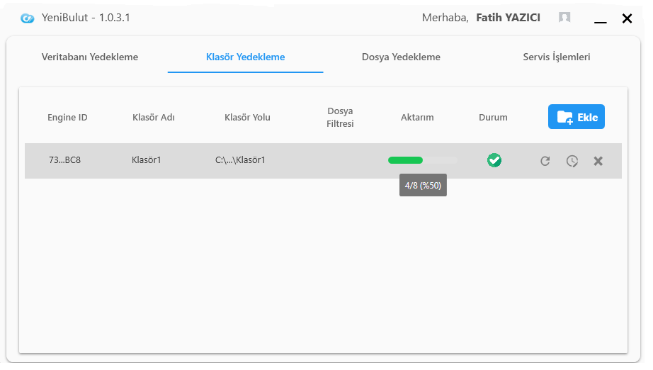 Aşağıdaki ekranda görebileceğiniz üzere, bilgisayarınıza kurulan Yenibulut Yedekleyici üzerinden buluta gönderilmesini istediğiniz klasörleri seçebilir ve bu klasörler için “dinleme” özelliğini aktif edebilirsiniz. Dinleme özelliği aktif edildiğinde, ilgili klasöre eklediğiniz her yeni dosya, oluşturduğunuz her alt klasör veya mevcut dosyalar üzerinde yaptığınız her değişiklik anlık olarak buluta aktarılır. Böylece seçili klasörleriniz daima güncel ve güvenli şekilde bulut ortamında saklanmış olur.